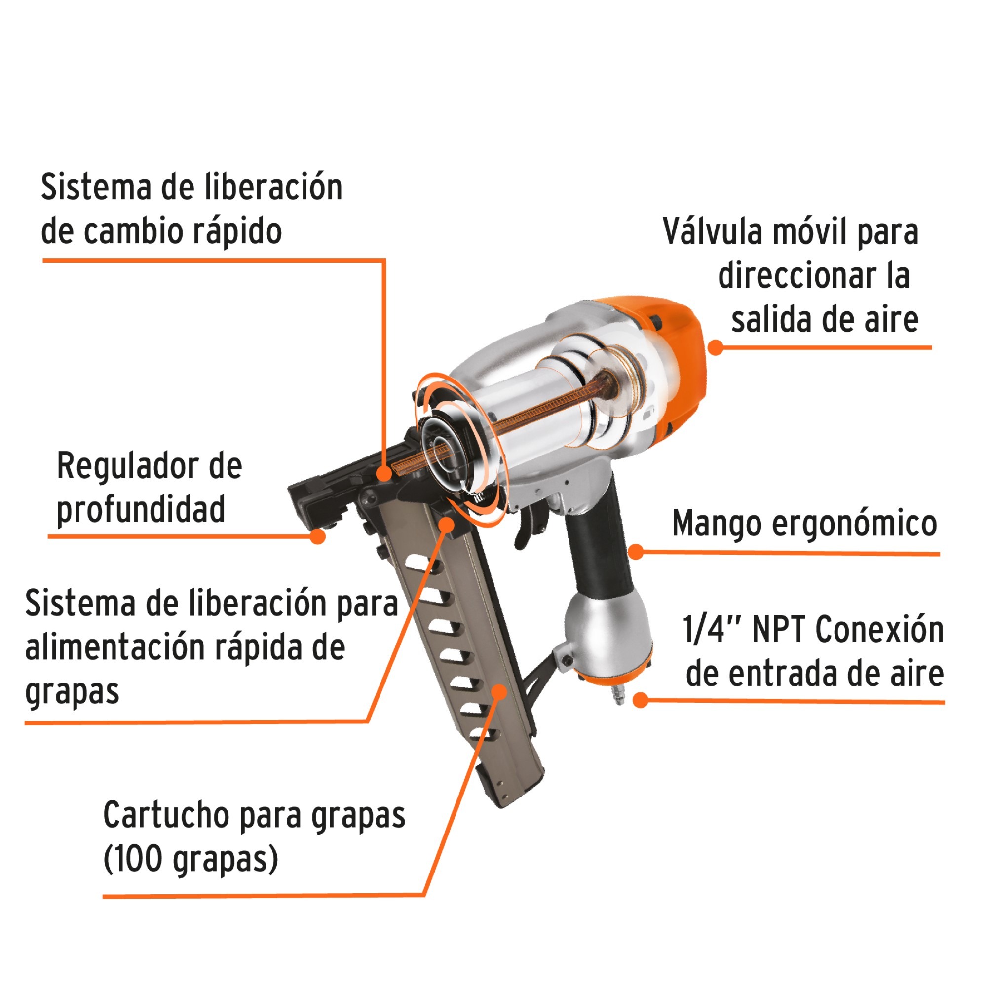 ■ Utiliza grapas calibre 16, largo desde 3/4″ hasta 2″ (cartucho para 100 grapas)