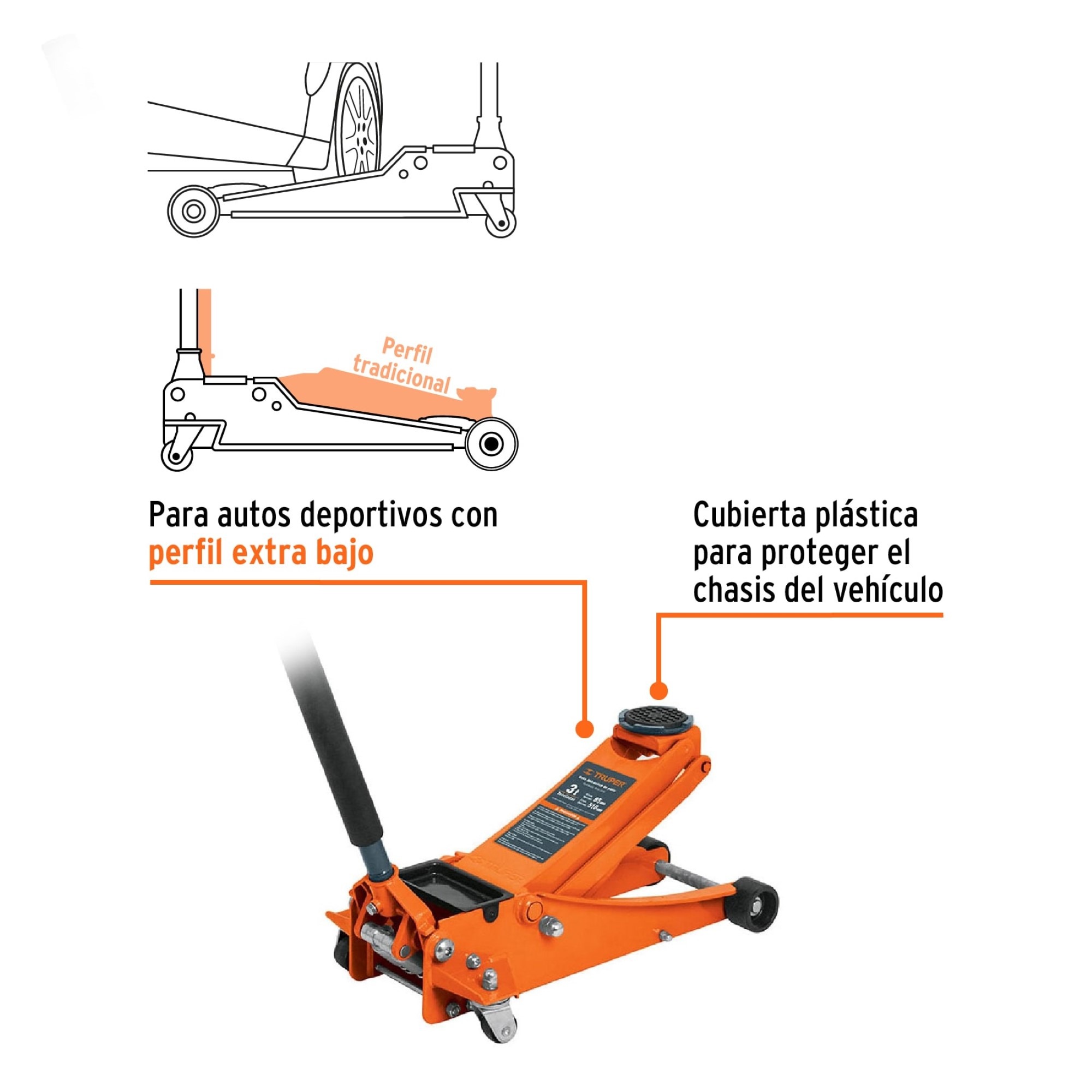 El Gato Hidráulico Profesional de Patín de 3 toneladas ofrece elevación rápida y es diseñado especialmente para autos deportivos con perfil extra bajo. Su cuerpo de acero proporciona durabilidad. Equipado con ruedas traseras giratorias para un manejo fácil, cuenta con una válvula de seguridad que previene la sobrecarga. La doble bomba incrementa la fuerza y velocidad de levantamiento, asegurando eficiencia en las operaciones.