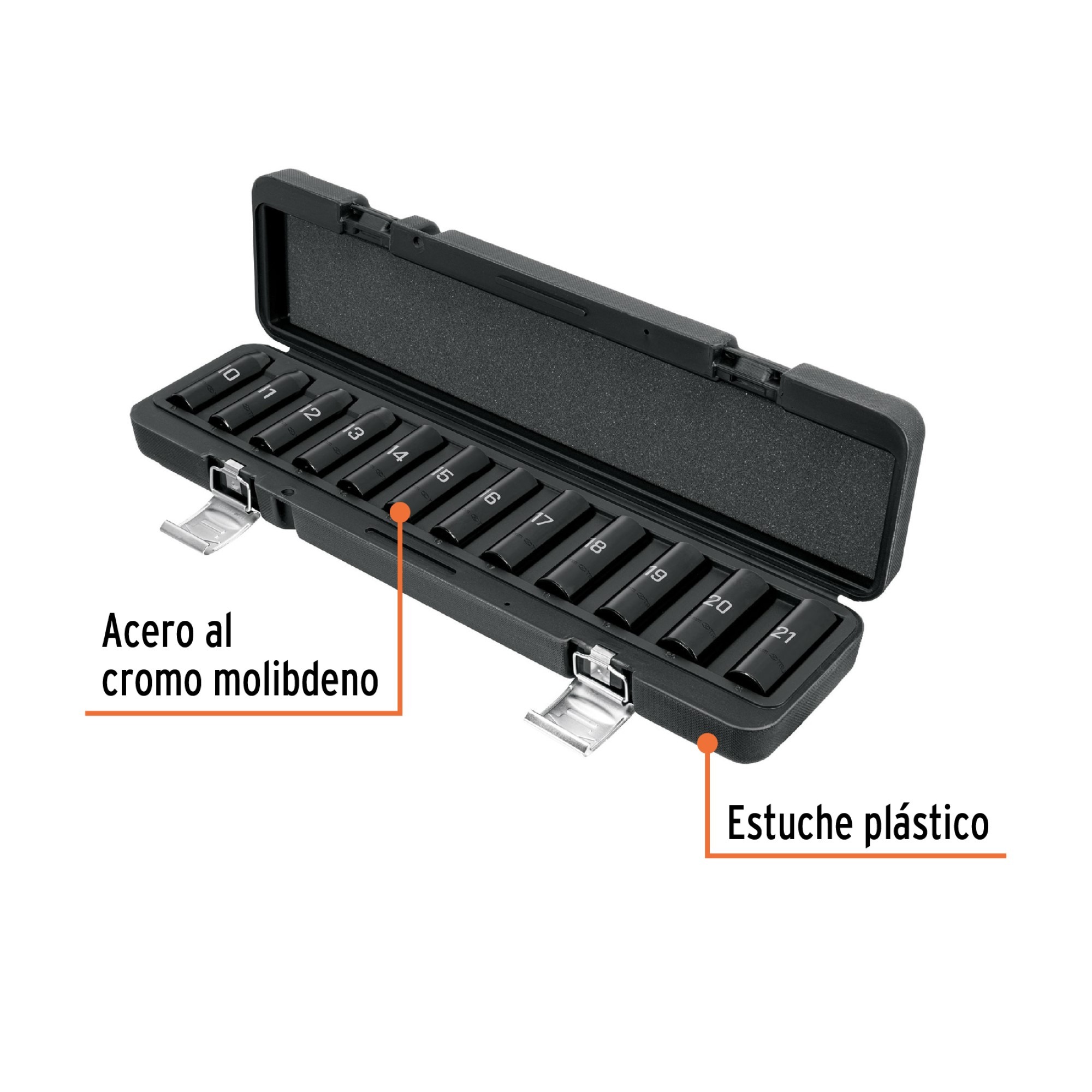 Enfrenta desafíos con nuestro juego de 12 dados largos de impacto, cuadro de 1/2″ y 6 puntas mm. Diseñados para brindar versatilidad en proyectos diversos, estos dados ofrecen el alcance adicional necesario para trabajos específicos. Fabricados con resistente acero, aseguran durabilidad y rendimiento duradero. Las 6 puntas mm permiten enfrentar una amplia gama de tareas con precisión. Este juego es esencial tanto para Profesionales como para entusiastas del bricolaje
