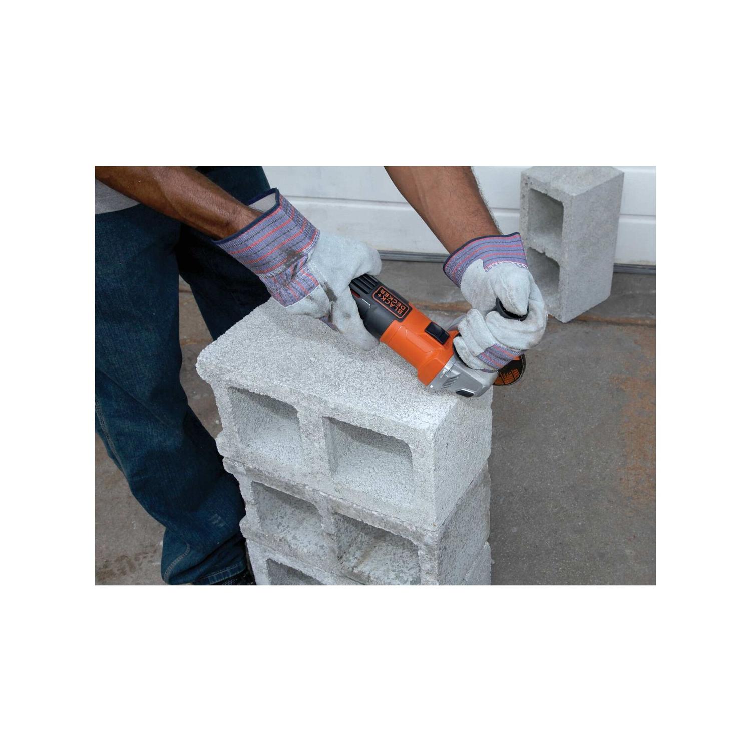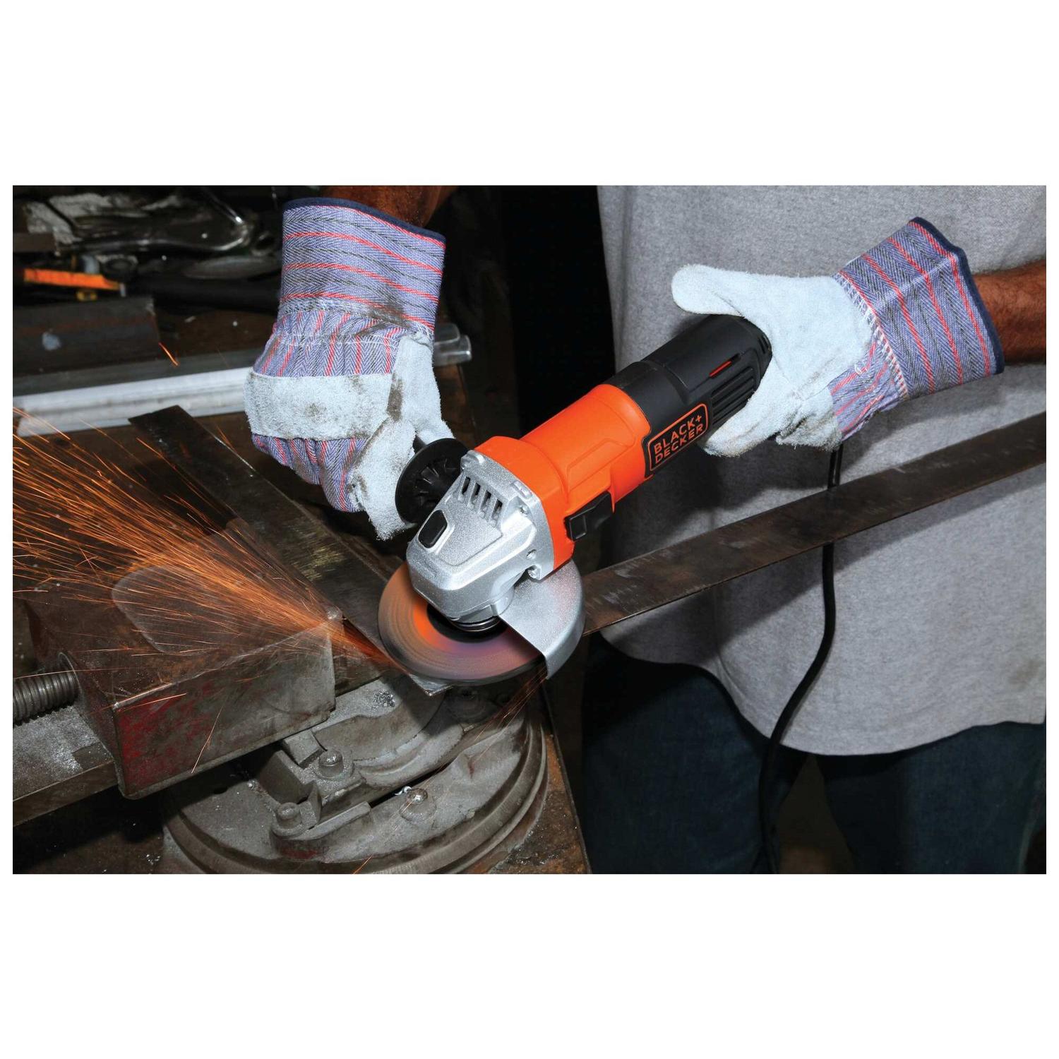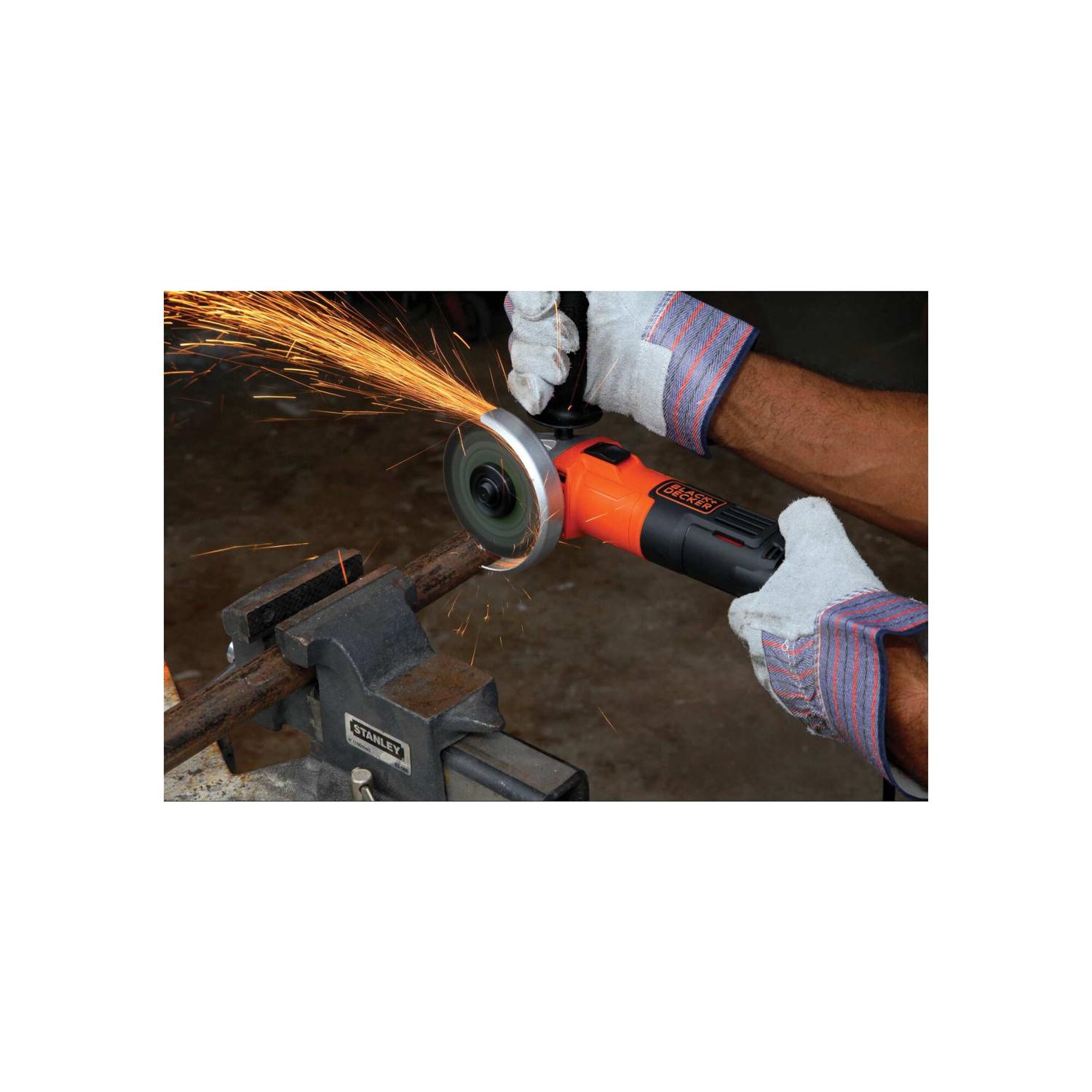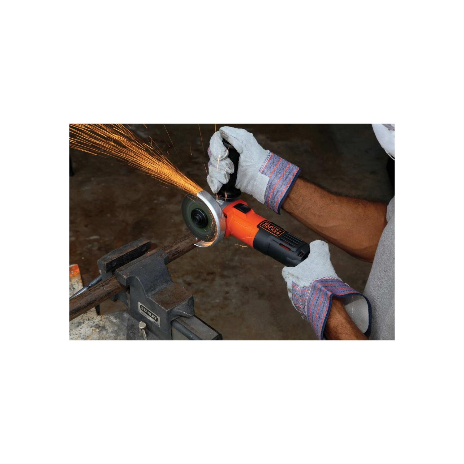 FUERZA Y CORTE AL INSTANTE Pulidora Angular 4-1/2″ 650W + 10 Discos De Corte de la marca Black+Decker; ideal para cortar metal, piedra, láminas, soldadura, eliminar óxido y perfiles resistentes. Velocidad de giro alta para cortes limpios, carcasa metálica para mayor durabilidad, botón de bloqueo del eje para cambio seguro de discos. Mango lateral de 3 posiciones para ergonomía, y protección contra rebote.